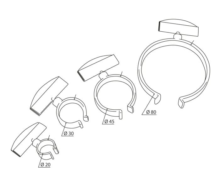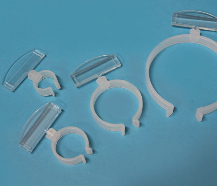 Držáky s objímkou pro uchycení etiket a cen na podlouhlé produkty.