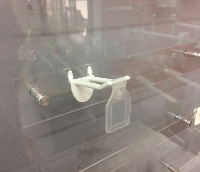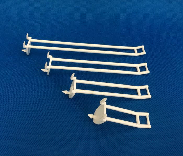 Dvojitý zatloukací hák pro kartonové výstavní stojany s výstupky chránícími produkty před spadnutím.