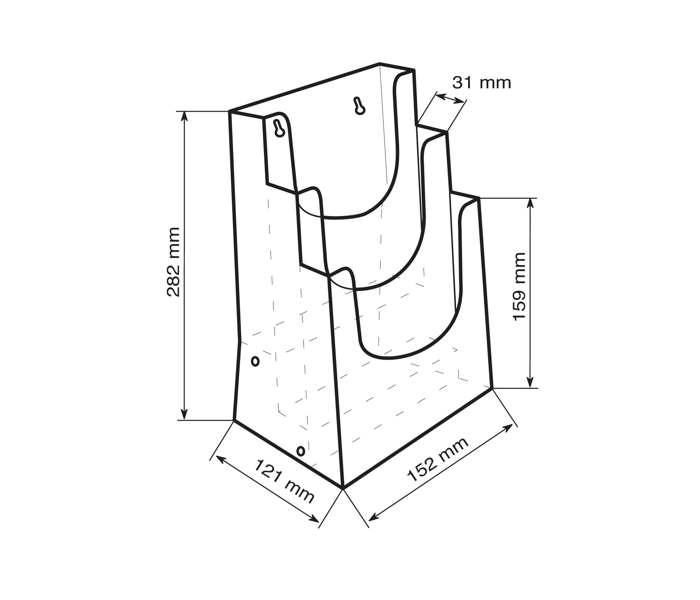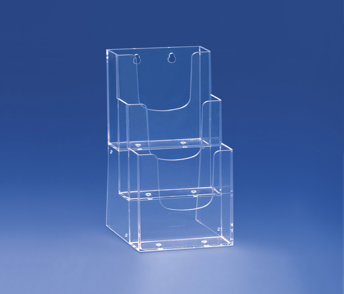 Stojan má 3 úrovně, do kterých lze umístit letáky a prospekty formátu A5, což umožňuje prezentaci 3 různých tiskovin nebo většího množství jednoho typu.